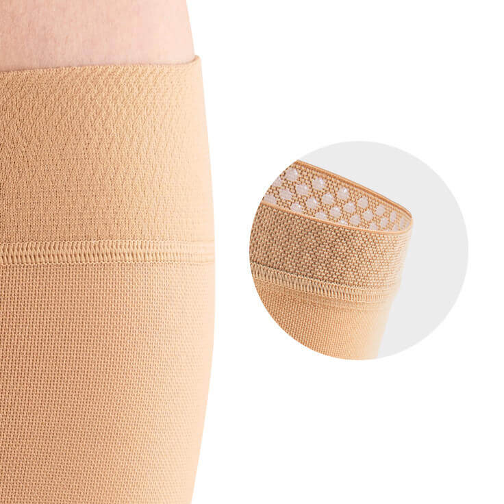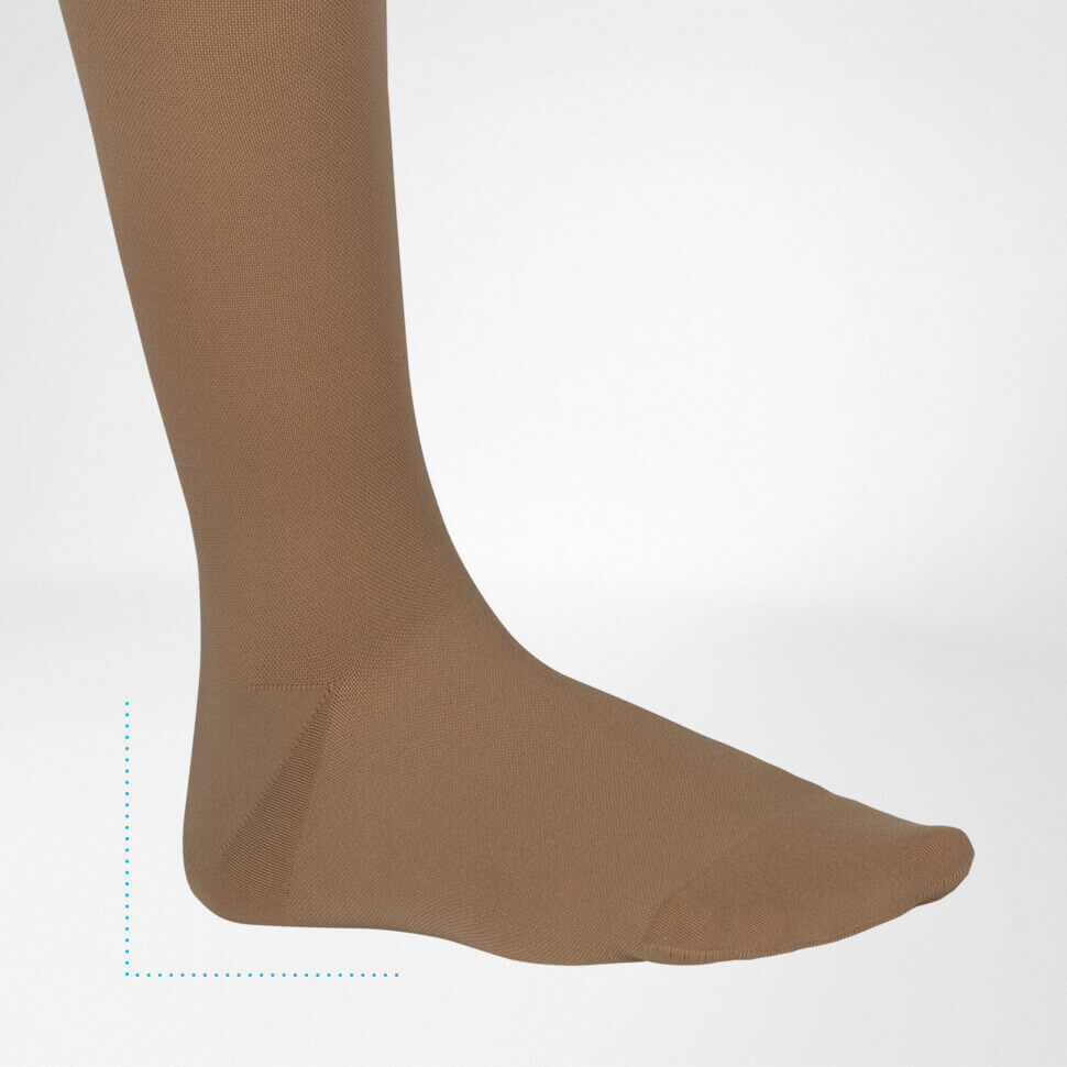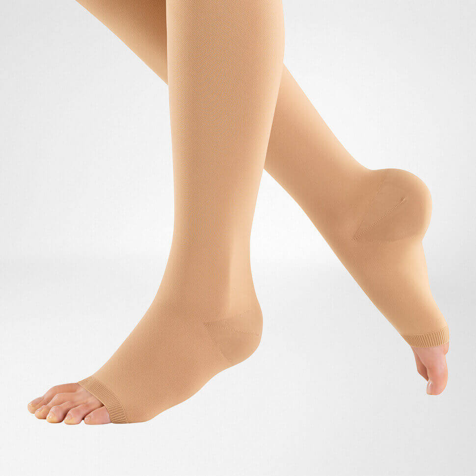Das atmungsaktive, hautfreundliche Gestrick ist ideal für empfindliche, durch Schwellungen gespannte Haut. Für ein Mehr an Zehenfreiheit ist er auch mit offener Fußspitze erhältlich.