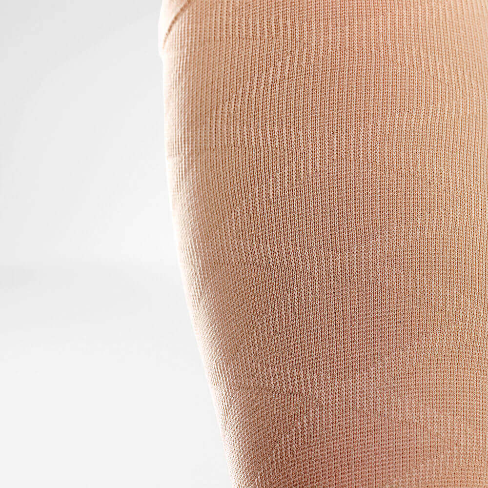 Le sous-bas, disponible en tant que mi-bas ou bas cuisse, est adapté à une utilisation longue durée grâce à ses matériaux hypoallergéniques. Il peut facilement être tiré au-dessus d'un pansement pour maintenir celui-ci en place. Comme il procure simultanément une légère compression durable, il peut être porté la nuit sans sur-bas. Lavable jusqu'à 95°, il répond aux exigences d'hygiène les plus strictes. Combiné au sous-bas, le sur-bas a les propriétés classiques d'un bas de compression : il soutient le système veineux*** et favorise la microcirculation cutanée****. Il favorise également une cicatrisation plus rapide des plaies. De plus, son tricot rhomboïdal spécialement conçu par Bauerfeind facilite l'enfilage et le retrait sans l'aide de personne.