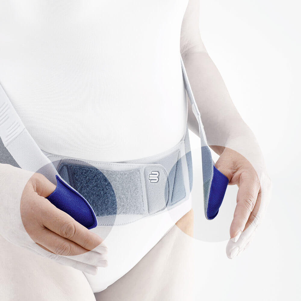 Le système de traction introduit des forces de redressement dans le haut du corps, ce qui évite la pression sur les organes de l'abdomen. Le parcours de la ceinture laisse le ventre et la poitrine libres, et garantit une respiration et une digestion faciles. En même temps, ton bassin est stabilisé par un bandage. Spinova Osteo soulage tes douleurs et réduit aussi ton risque de chute et t'aide à te déplacer debout dans la vie quotidienne.